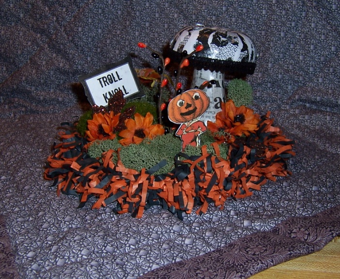 “Hey, Bellamine I know Mom said she wanted to hang this pretty pumpkin thingy that Oma Linda sent us on the wall but see how it matches this basket and it goes with our decorating scheme which is all about pumpkins. Well I’m thinking since it’s even the same orange as the orange of the basket and it looks like it’s the same diameter as the top opening, I’m thinking it will make a great looking lid.”